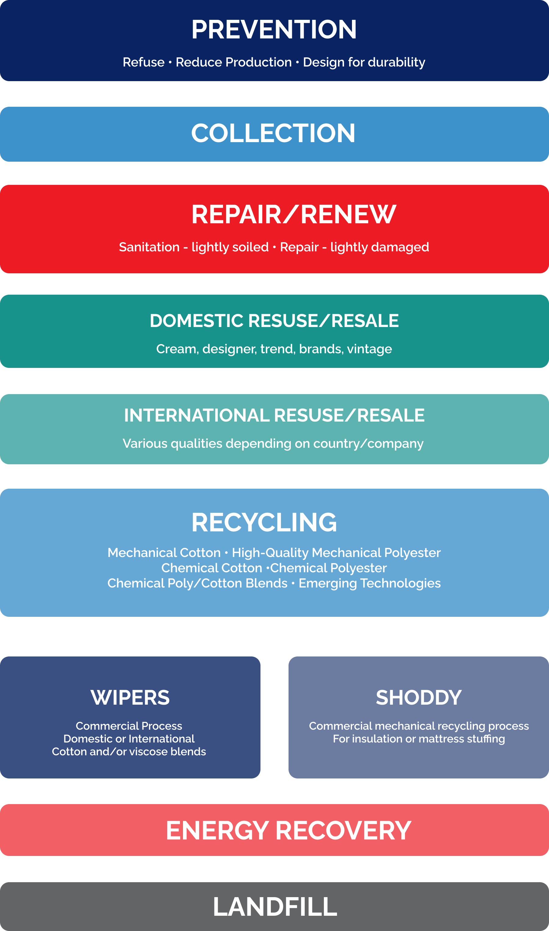 The Next Use Network follows the Spent Textile Hierarchy, which ranks textile management strategies from most to least preferred: